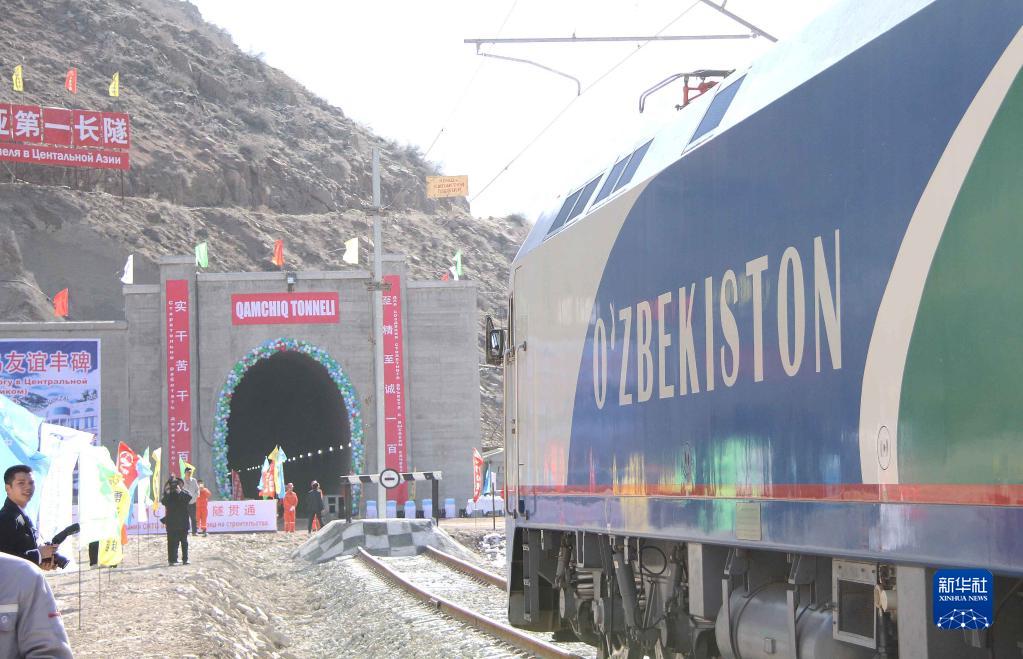 2016年2月27日,一列专列停在乌兹别克斯坦安格连-帕普铁路卡姆奇克隧道进口。中国政府优买项目、中铁隧道集团承担的中亚最长隧道——乌兹别克斯坦安格连-帕普铁路卡姆奇克隧道2月27日全隧贯通。卡姆奇克隧道长19.26公里,是中亚第一长隧。新华社记者沙达提摄
