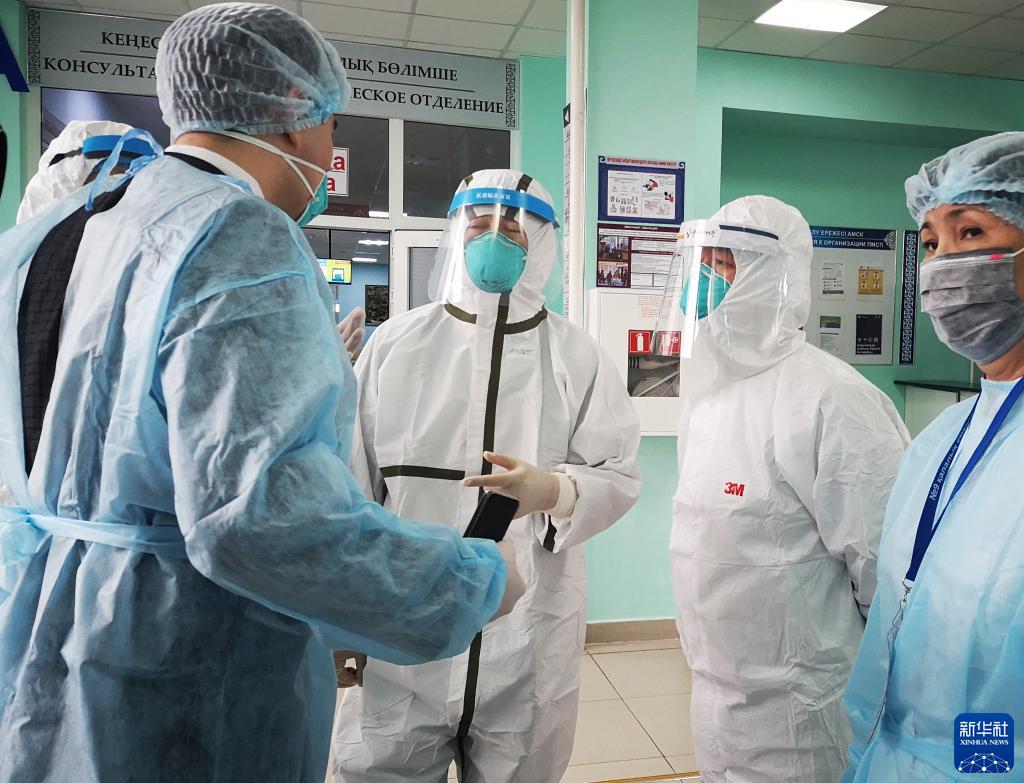 2020年4月14日,在哈萨克斯坦努尔苏丹第九综合医院,中国援哈医疗队成员与哈萨克斯坦医护人员交流如何优化医院管理减少院内感染。新华社发(哈萨克斯坦实业报供图)