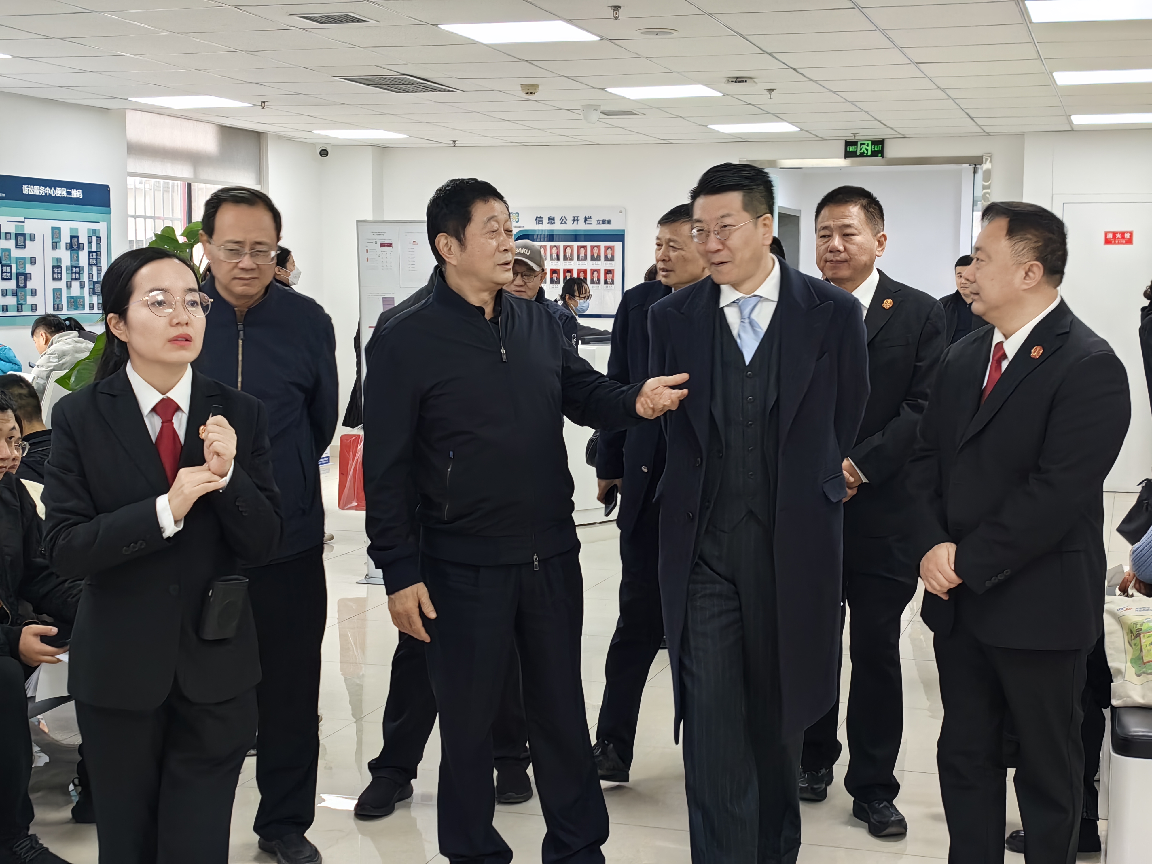 肖西亮一行在莲湖区法院诉讼服务中心了解莲湖法院诉讼服务新举措及智慧法院建设成果。随后到碑林区检察院调研检察机关案件办理基本情况,了解碑林区检察机关党建业务融合、检察品牌建设、民事法律监督开展情况及检察文化建设情况。