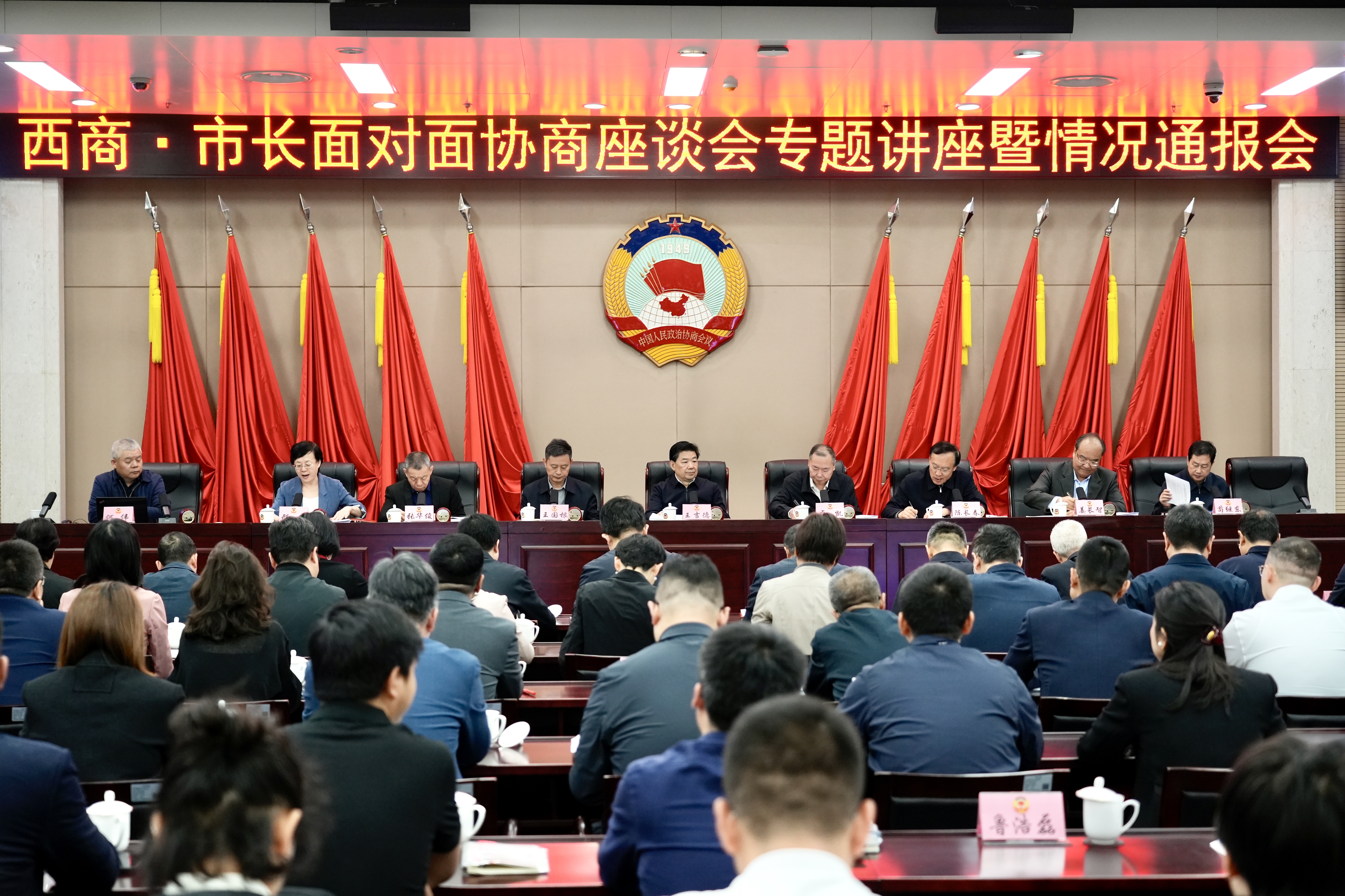 4月11日,市政协召开西商·市长面对面协商座谈会专题讲座暨情况通报会。市政协主席王吉德出席并讲话。市政协领导班子成员参加。