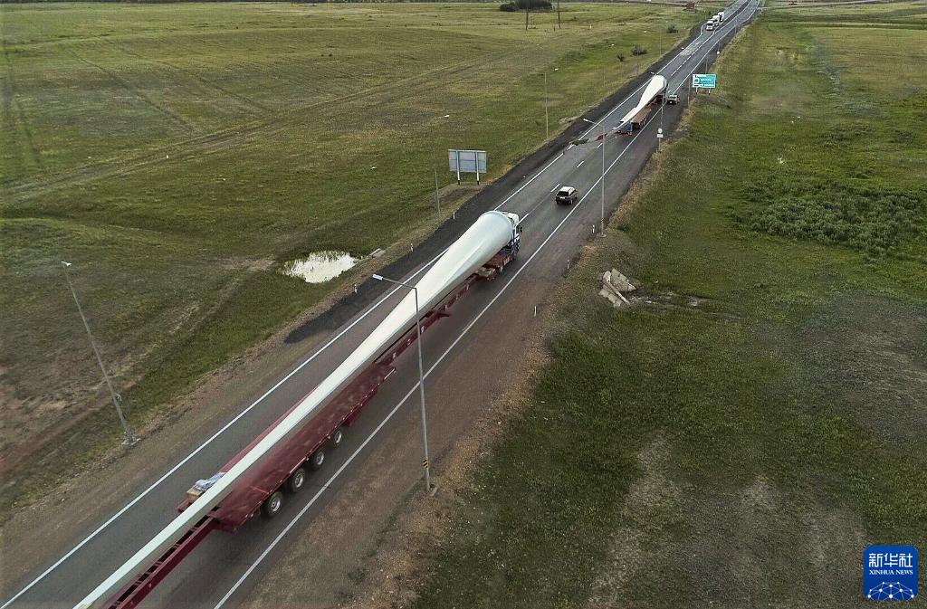 2020年6月23日,在哈萨克斯坦卡拉干达至努尔苏丹段公路,卡车车队运输70米长的风机叶片(无人机拍摄)。新冠疫情期间,中国和哈萨克斯坦克服困难,继续推动新能源领域合作。中国生产的风电设备跨越数千公里运输至哈萨克斯坦,助力哈萨克斯坦可再生能源项目。新华社发(奥斯潘诺夫摄)