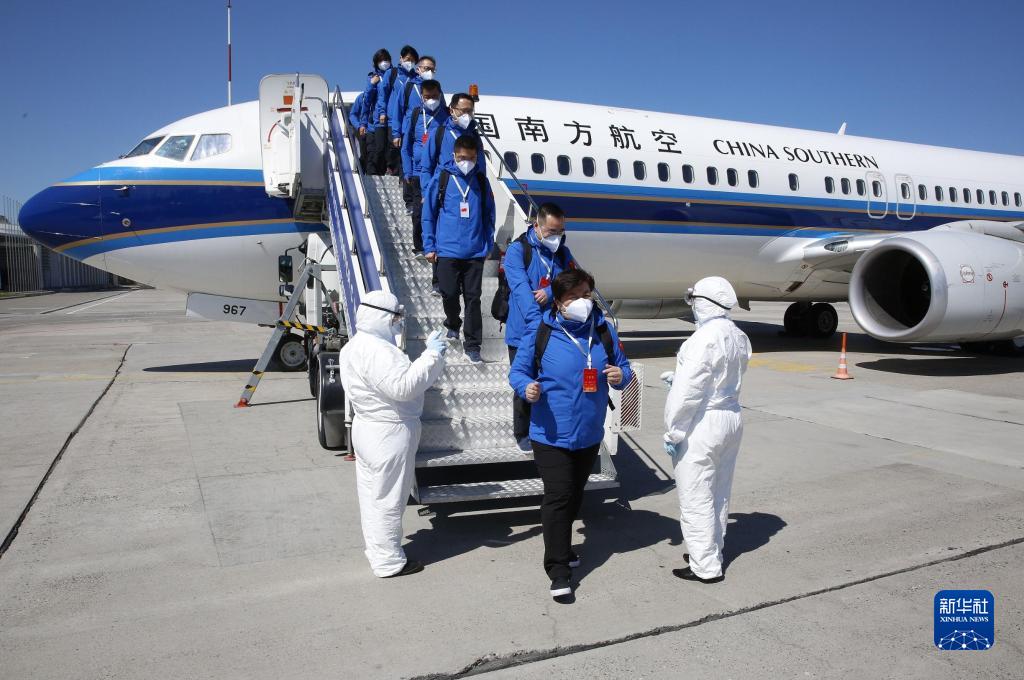2020年4月20日,在吉尔吉斯斯坦首都比什凯克玛纳斯国际机场,中国赴吉尔吉斯斯坦联合工作组成员走下飞机。联合工作组随机携带了由新疆维吾尔自治区捐赠的一批抗疫医疗物资。新华社发(罗曼摄)