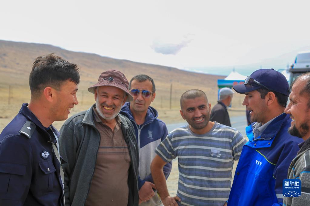 2019年6月11日,位于新疆塔什库尔干塔吉克自治县的卡拉苏出入境边防检查站的民警向塔吉克斯坦司机介绍出入境相关事宜。新华社发(黄欢 摄)