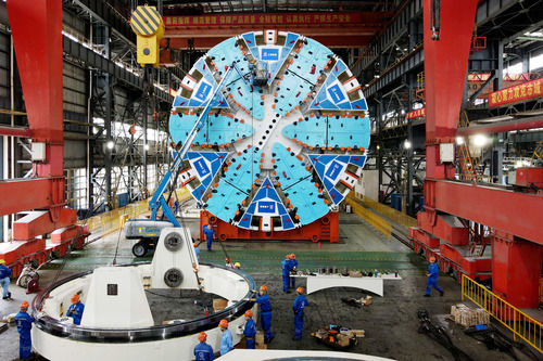 2020年10月15日,在隧道股份上海隧道工程有限公司机械制造分公司生产车间,工人对“骐跃”盾构机进行安装调试。新华社记者 方喆 摄