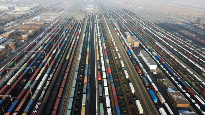 新疆阿拉山口口岸内出入境班列正集结出发。新华社照片