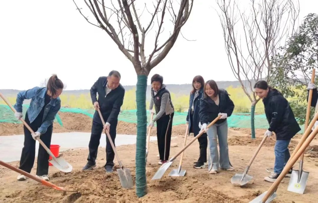植树现场,大家热情高涨、干劲十足,分工有序、相互配合,挖坑、施肥、扶苗、填土、培实、浇水……每道工序有条不紊,每棵树苗精心栽种,经过2个多小时的辛勤劳动,栽种了10余株树径如碗口粗的樱花、海棠、玉兰、石楠、桂花树,一株株树苗迎风挺立,尽显盎然生机。
